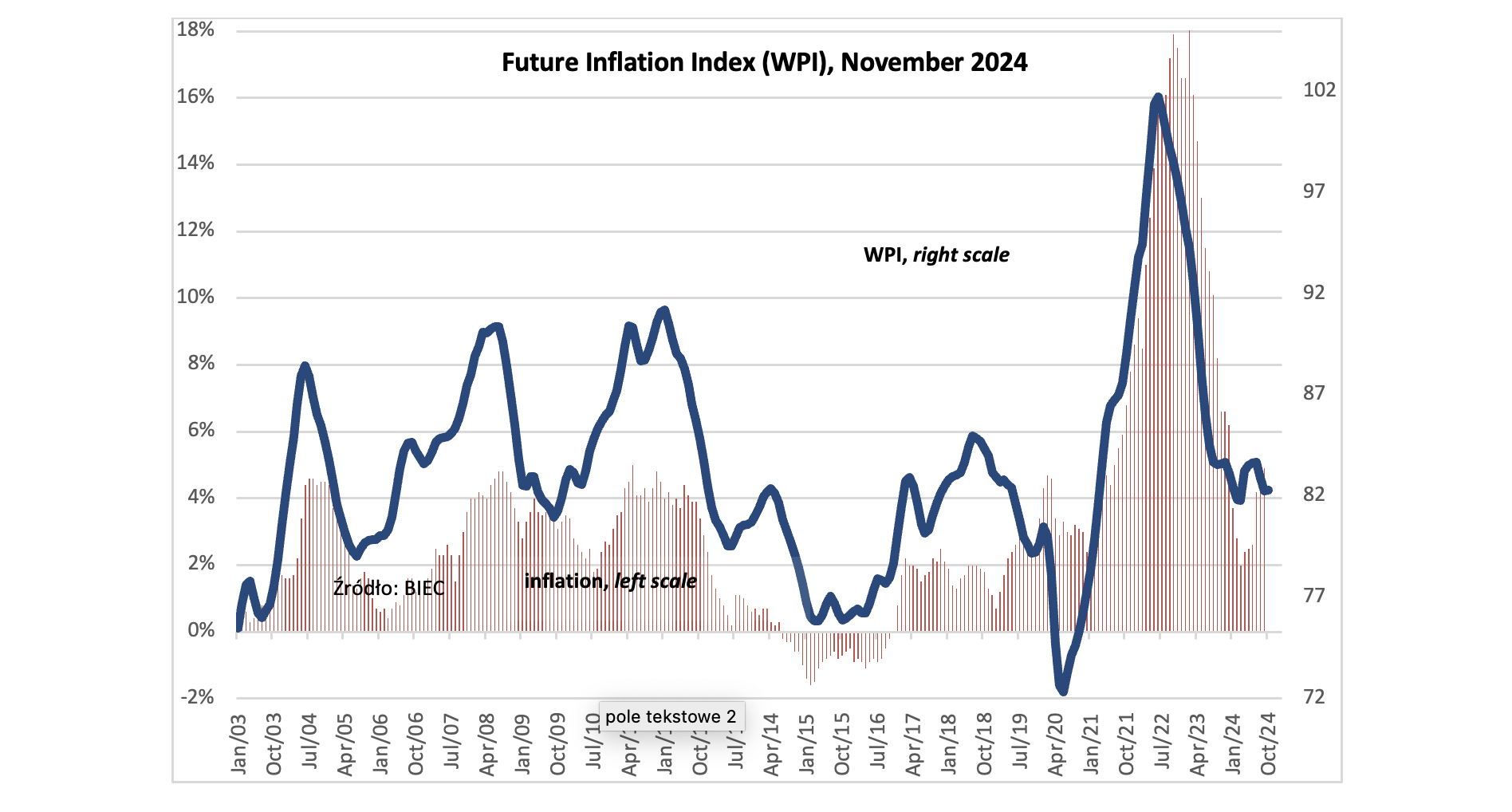 The Future Inflation Index (WPI), which forecasts changes in consumer goods and services prices for the coming months, remains unchanged in November 2024 compared to the previous month. The decline in inflation expectations from both consumers and businesses has contributed to this stable outlook. However, rising raw material prices on global markets, increasing government borrowing costs, and the weakening of the złoty against the US dollar could push inflation higher.