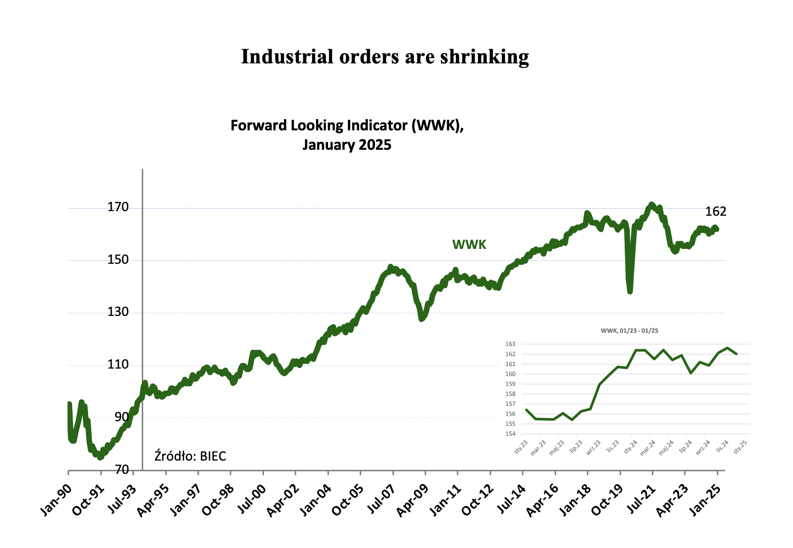 The Economic Outlook Indicator (WWK), which provides early signals on economic trends, declined by 0.6 points in January 2025 compared to December, signaling ongoing economic stagnation. Despite hopes for improvement, key indicators such as new manufacturing orders, corporate investment credit, and mortgage demand show no significant recovery. Inflation remains persistently high, further dampening economic activity.