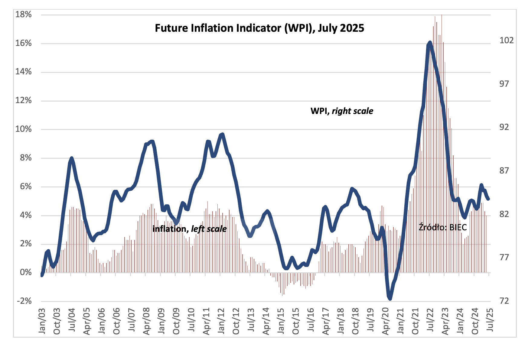 Poland’s Future Inflation Index (WPI), which signals expected movements in consumer prices over the coming months, fell by 0.3 points in July compared to June. This marks the fourth consecutive monthly decline, although the pace of decrease was slightly slower than in the previous month. The trend reflects lower readings in the country’s consumer price index (CPI).