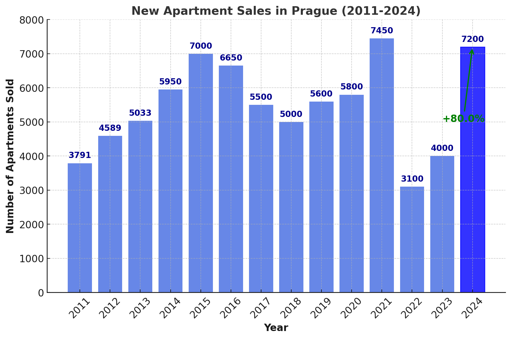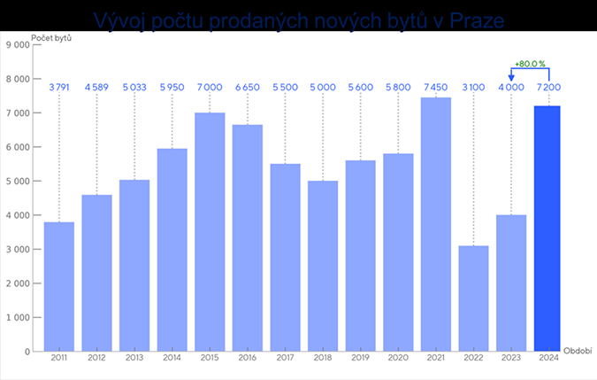 The Prague real estate market saw unprecedented demand for new apartments in 2024, with 7,200 units sold, marking an 80% year-on-year increase. This surge, driven by lower mortgage rates, has outstripped supply, pushing prices up by 7%, according to a market analysis published by Central Group, Skanska Residential, and Trigema.