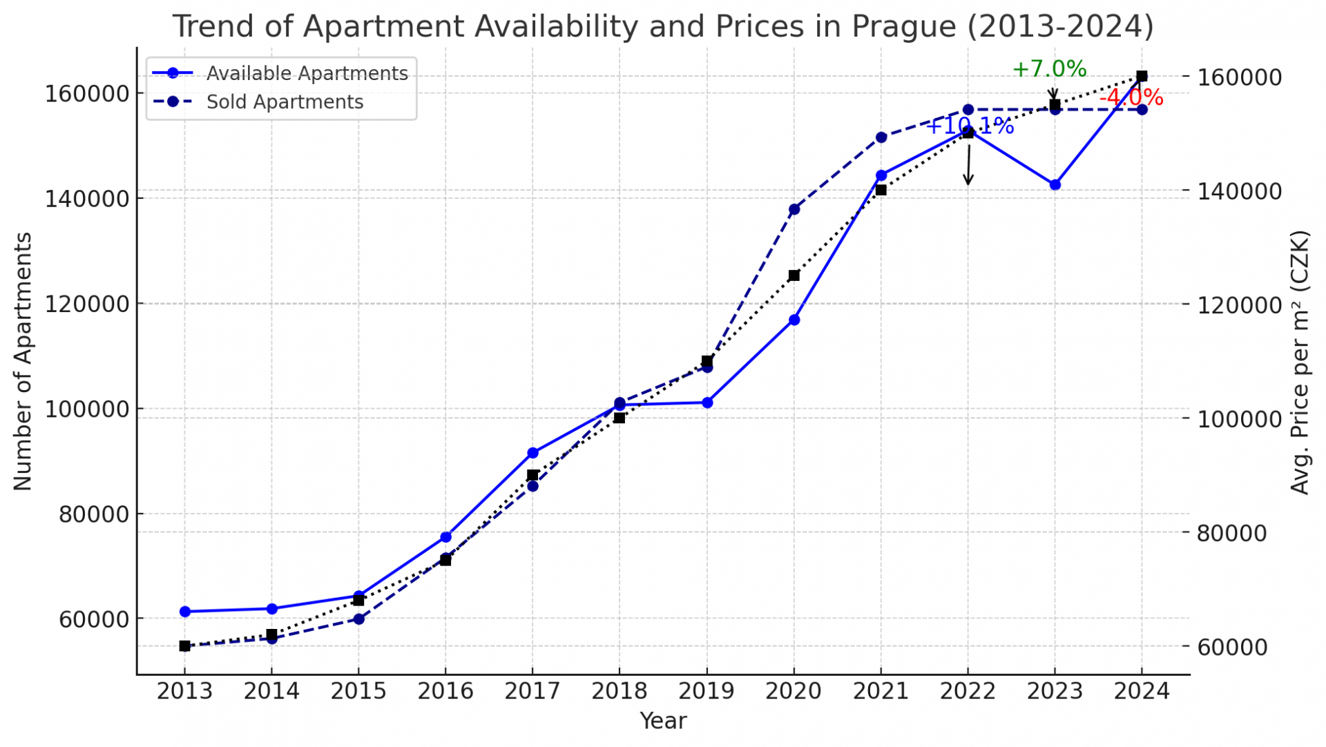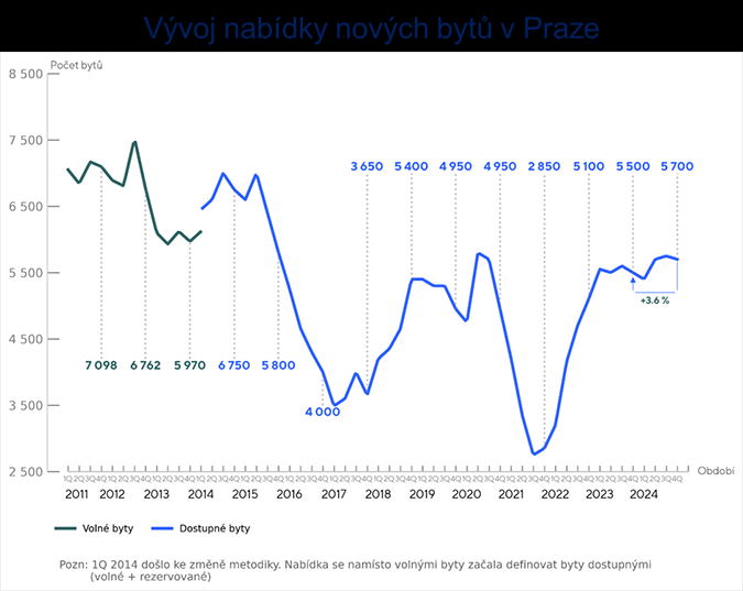 At the end of 2024, only 5,700 new apartments were available in Prague—a stagnant figure for the past two years. While more units entered the market than in previous years, this failed to meet demand, as most were delayed projects launched when market conditions improved.
