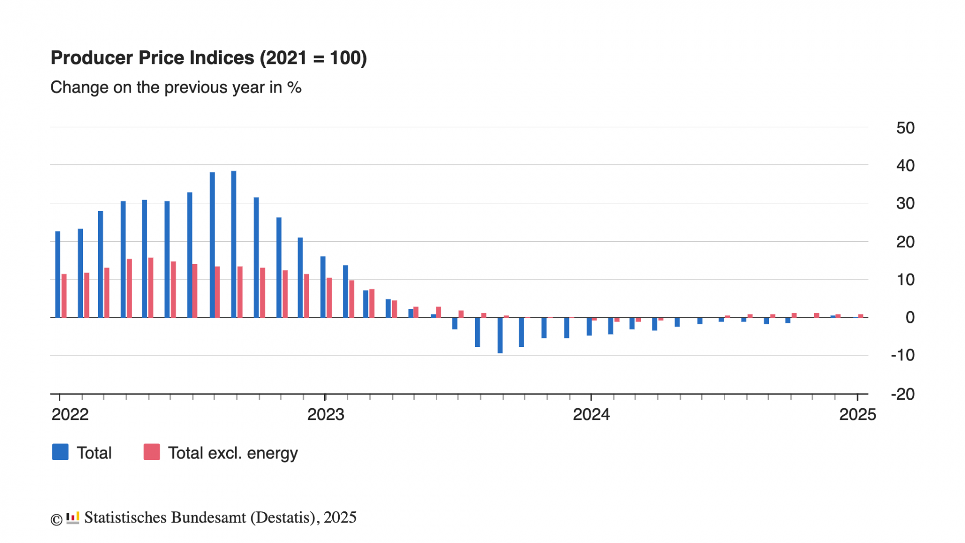 The Federal Statistical Office (Destatis) has reported that producer prices of industrial products in Germany were 0.5% higher in January 2025 compared to the same month in 2024. This marks a slowdown from the 0.8% increase recorded in December 2024. On a month-to-month basis, producer prices fell slightly by 0.1% from December 2024 to January 2025.