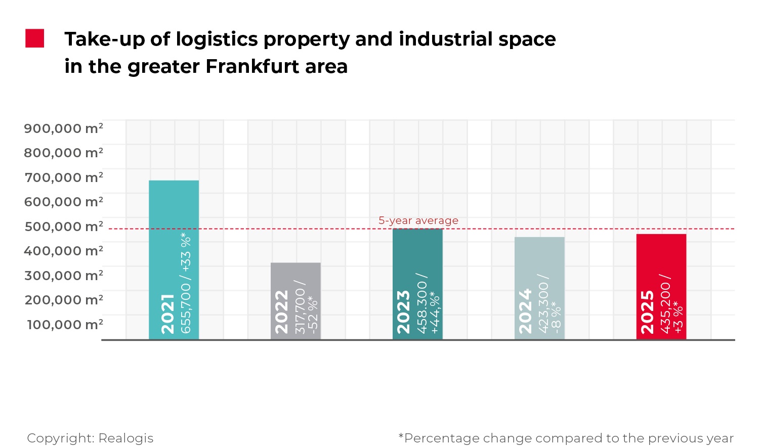 According to REALOGIS, take-up in the Greater Frankfurt industrial and logistics property market reached 435,200 sq m in 2025, reflecting a year-on-year increase of 3%. Despite the improvement, activity remained around 5% below the five-year average of 458,040 sq m. The largest transactions during the year were signed by Shaoke for 36,000 sq m and FIEGE for 30,700 sq m.