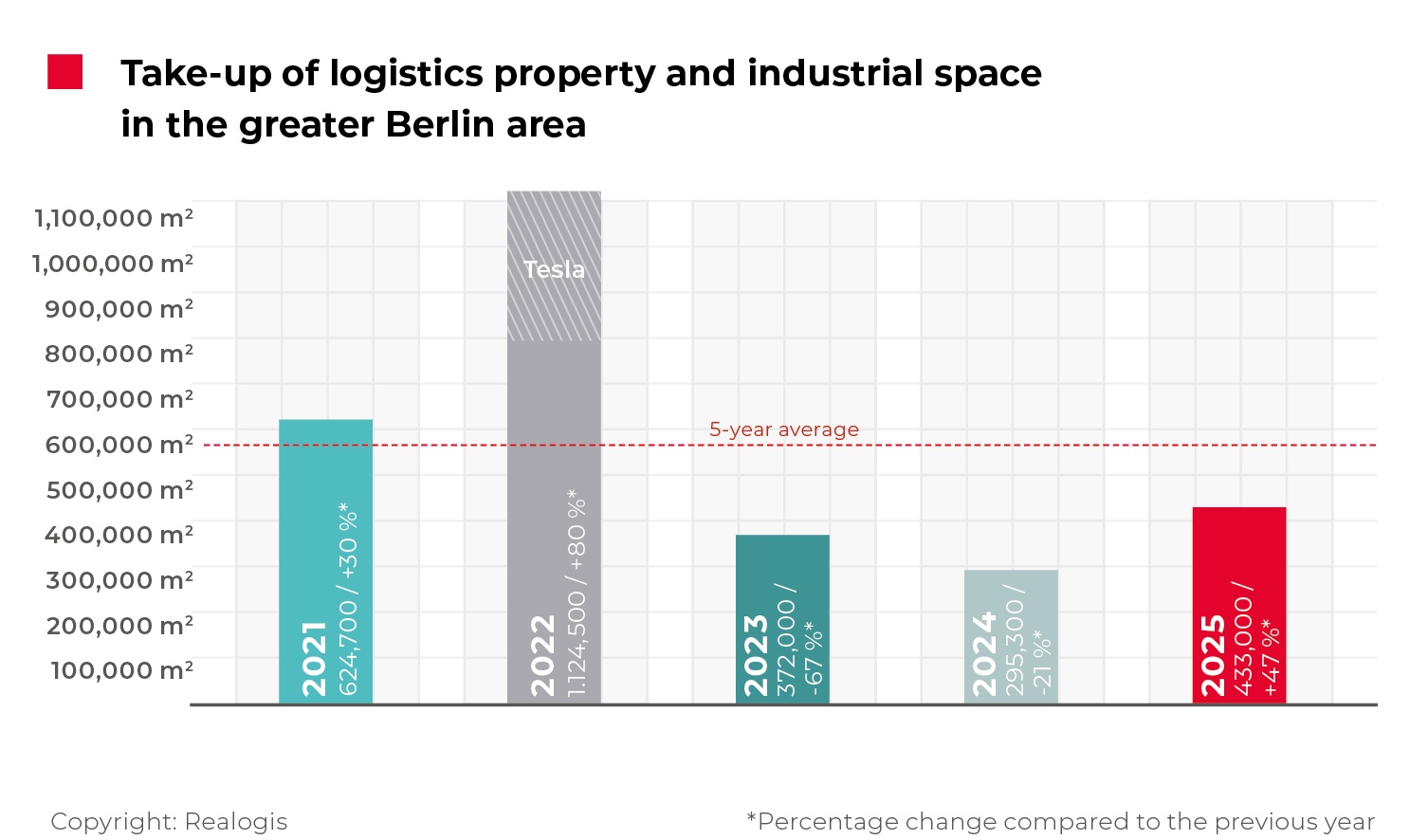 The logistics and industrial property market in Berlin showed clear signs of recovery in 2025, according to REALOGIS Unternehmensgruppe. After two weaker years, total take-up in the Berlin region reached 433,000 sq m, representing an increase of 47% compared with 2024. Despite this rebound, activity remained 24% below the five-year average of 569,900 sq m.