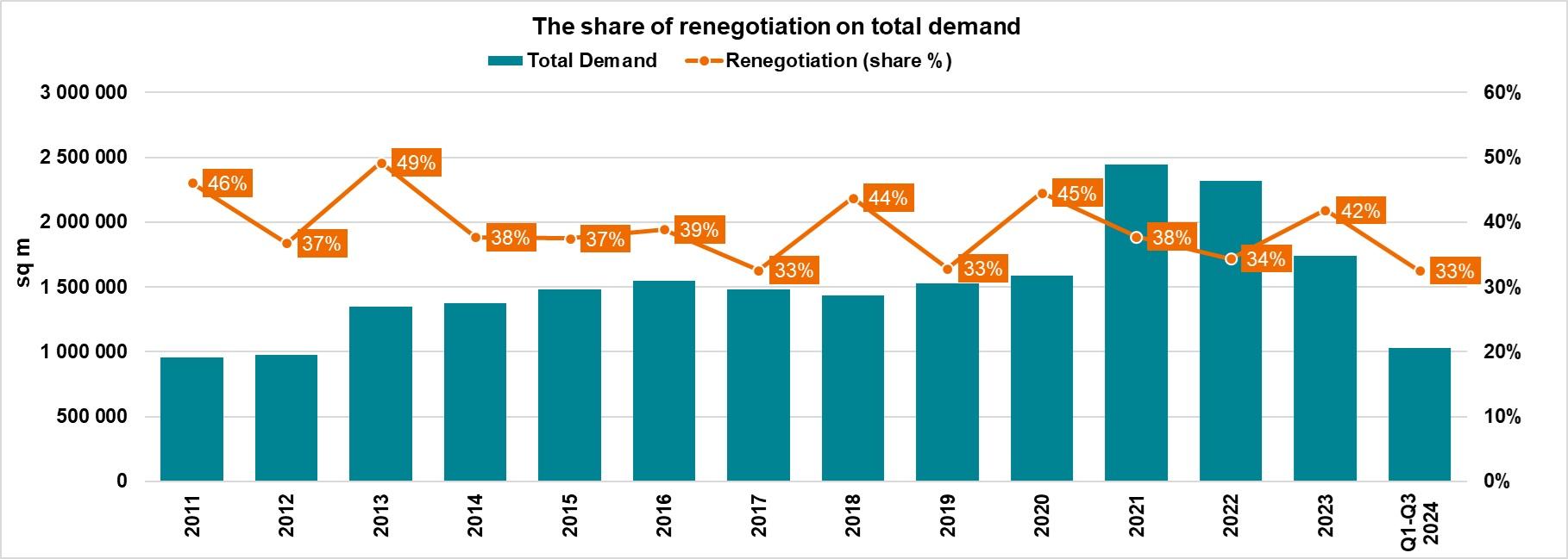 “The data confirms a strong trend in lease prolongations,” said Lenka Pechová, Senior Research Analyst at Savills. “For the first three quarters of 2024, renegotiations accounted for roughly one-third of gross demand, reflecting the preference of businesses to stay put and avoid the costs and complexities of relocating.”