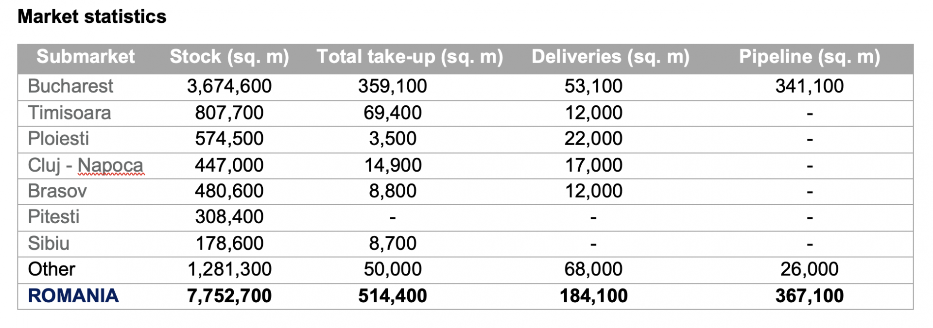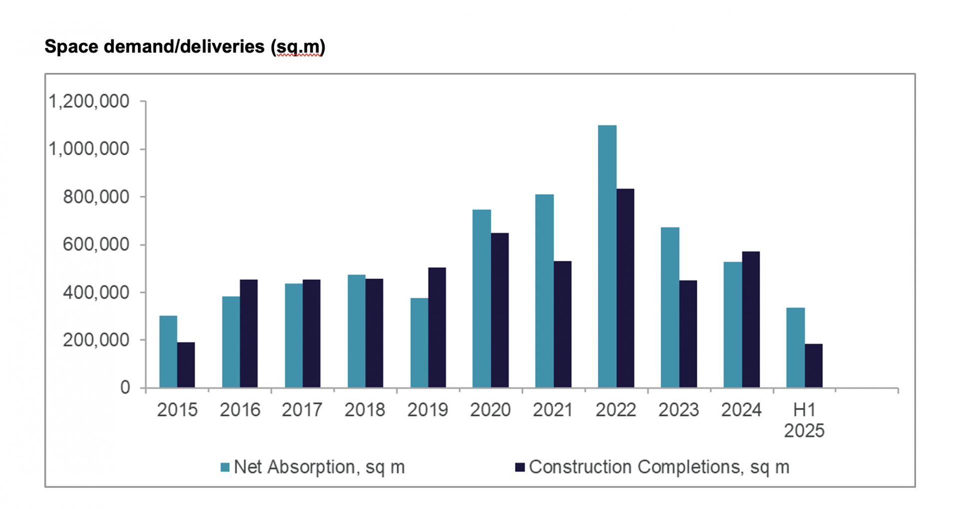 At the end of the second quarter, Romania’s modern industrial and logistics stock stood at 7.75 million square metres. Developers delivered new projects totalling 184,100 square metres during the first half of 2025, marking a 77% increase over the same period last year. The national construction pipeline remains active, with approximately 370,000 square metres under development.