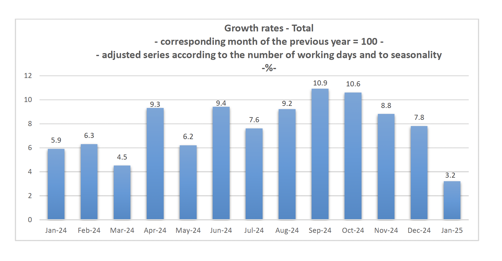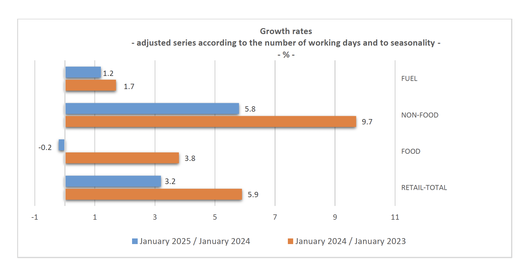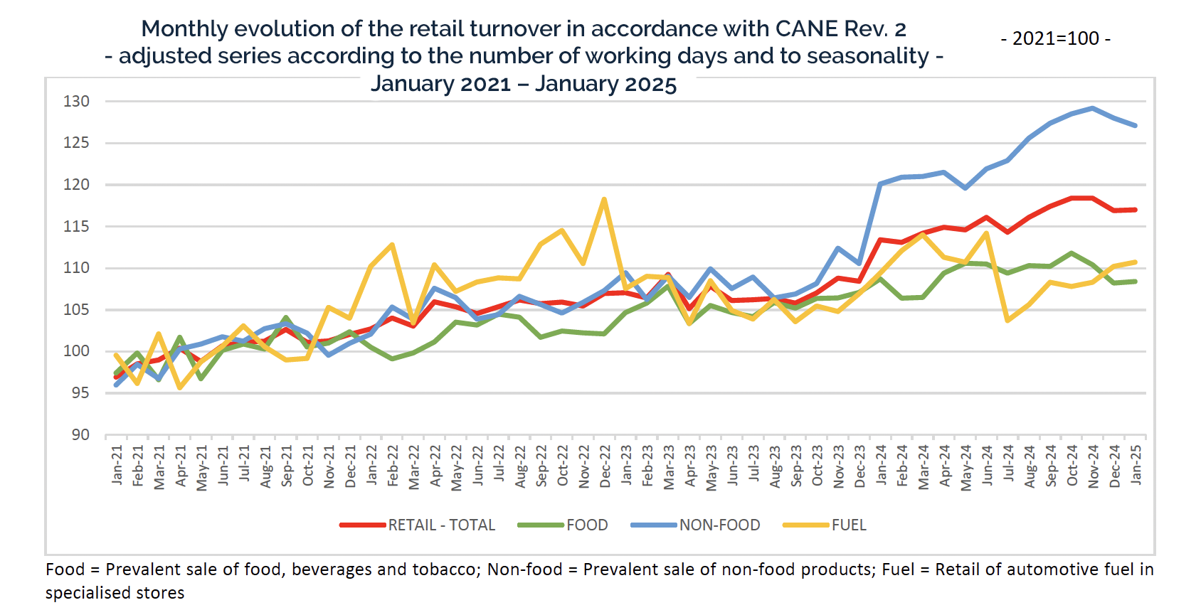 On a year-over-year basis, the retail sector presented a more optimistic picture. Compared to January 2024, the total retail turnover volume increased by 4.1% in gross series and by 3.2% in seasonally adjusted terms. This growth was largely driven by a strong performance in non-food retail, which recorded a 7.0% increase. The automotive fuel segment also contributed positively, with a rise of 7.3% in gross series and 1.2% in adjusted terms. Conversely, food, beverage, and tobacco sales declined by 0.9% in gross figures and showed a marginal decrease of 0.2% in seasonally adjusted data.