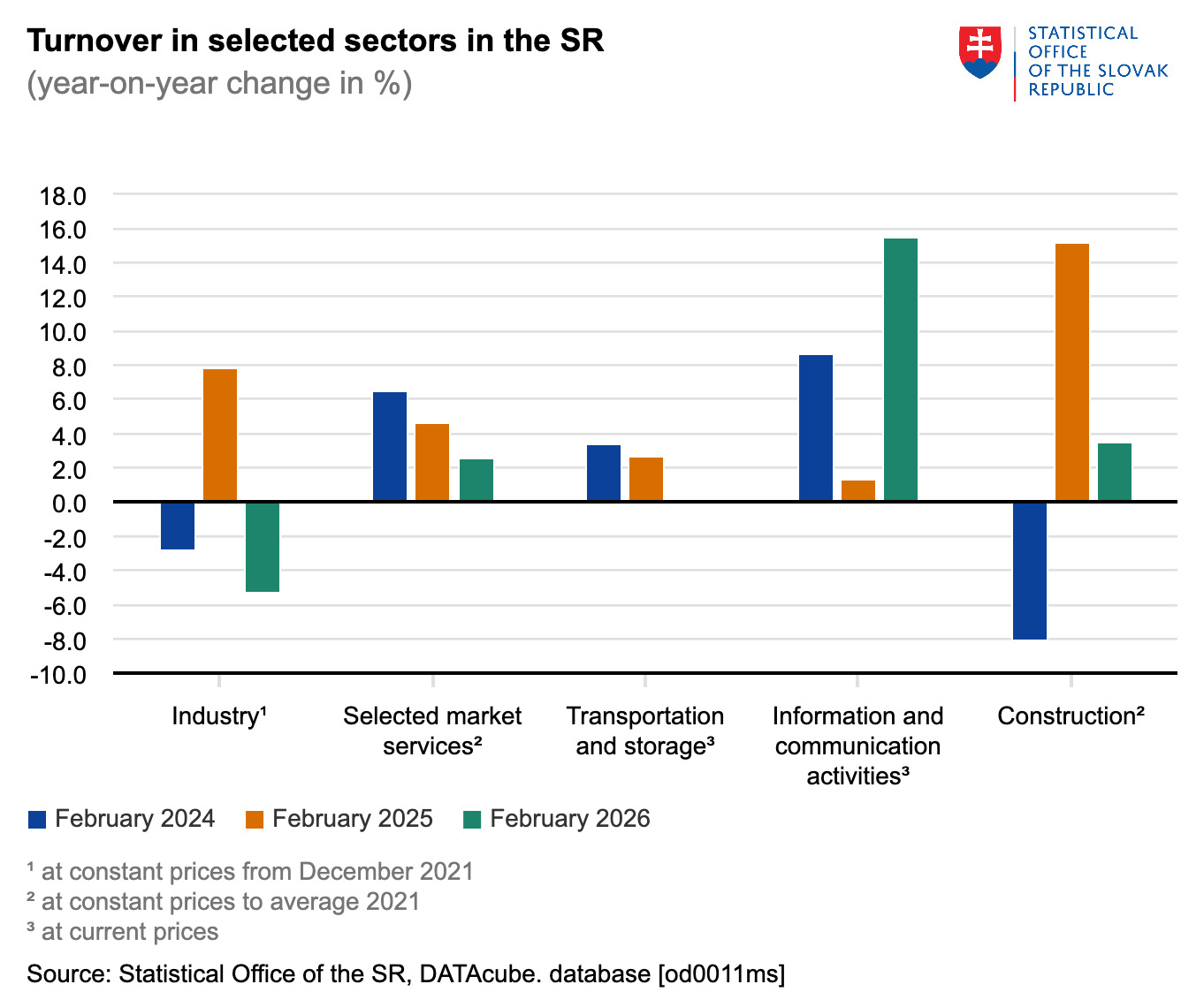 Turnover across selected sectors in Slovakia showed a mixed performance in February 2026, with most sectors recording growth, while industry continued to decline, according to data from the Statistical Office of the Slovak Republic.