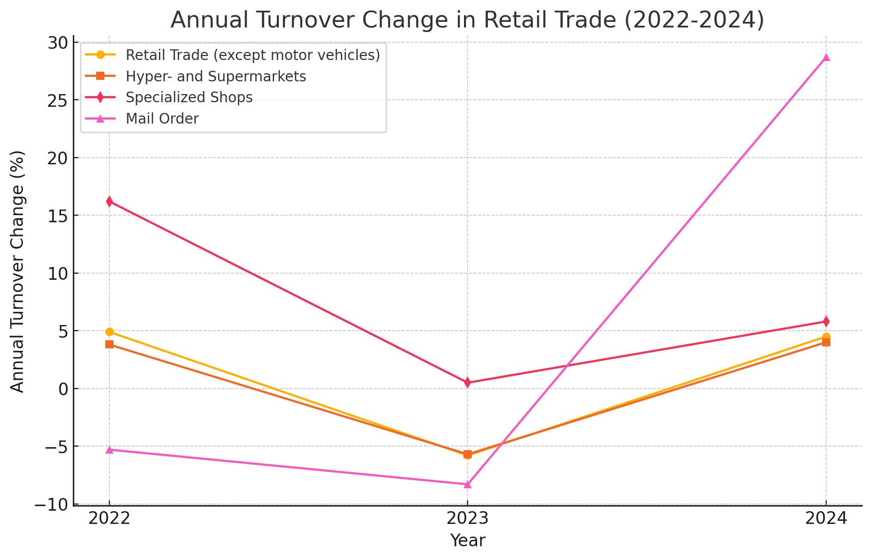 For the full year, retail turnover rose by 4.5%, one of the strongest performances since 2013. The growth was driven by large hyper- and supermarkets, as well as e-commerce, which saw significant expansion.