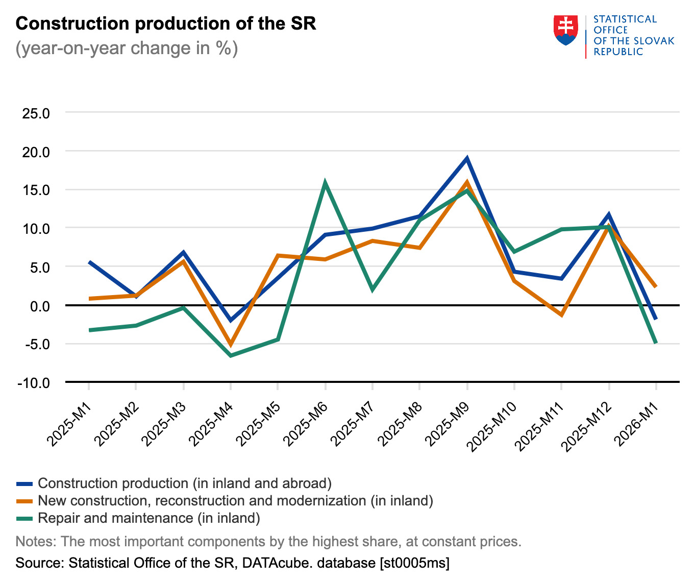 Slovak construction companies operating abroad also contributed to the weaker overall performance. Their activity represented around 12 percent of total construction production, but output generated outside the country dropped by nearly one fifth compared with January 2025.