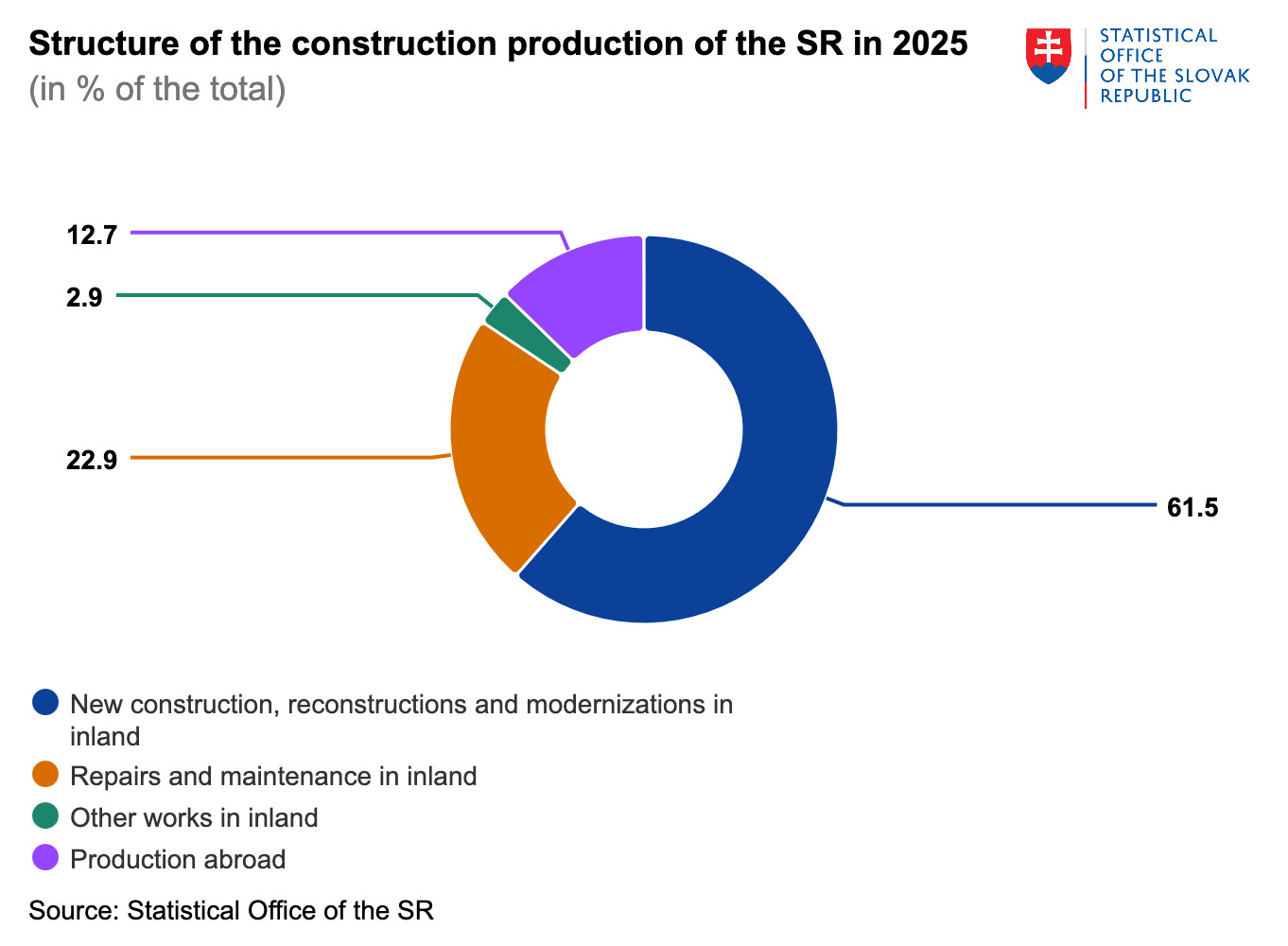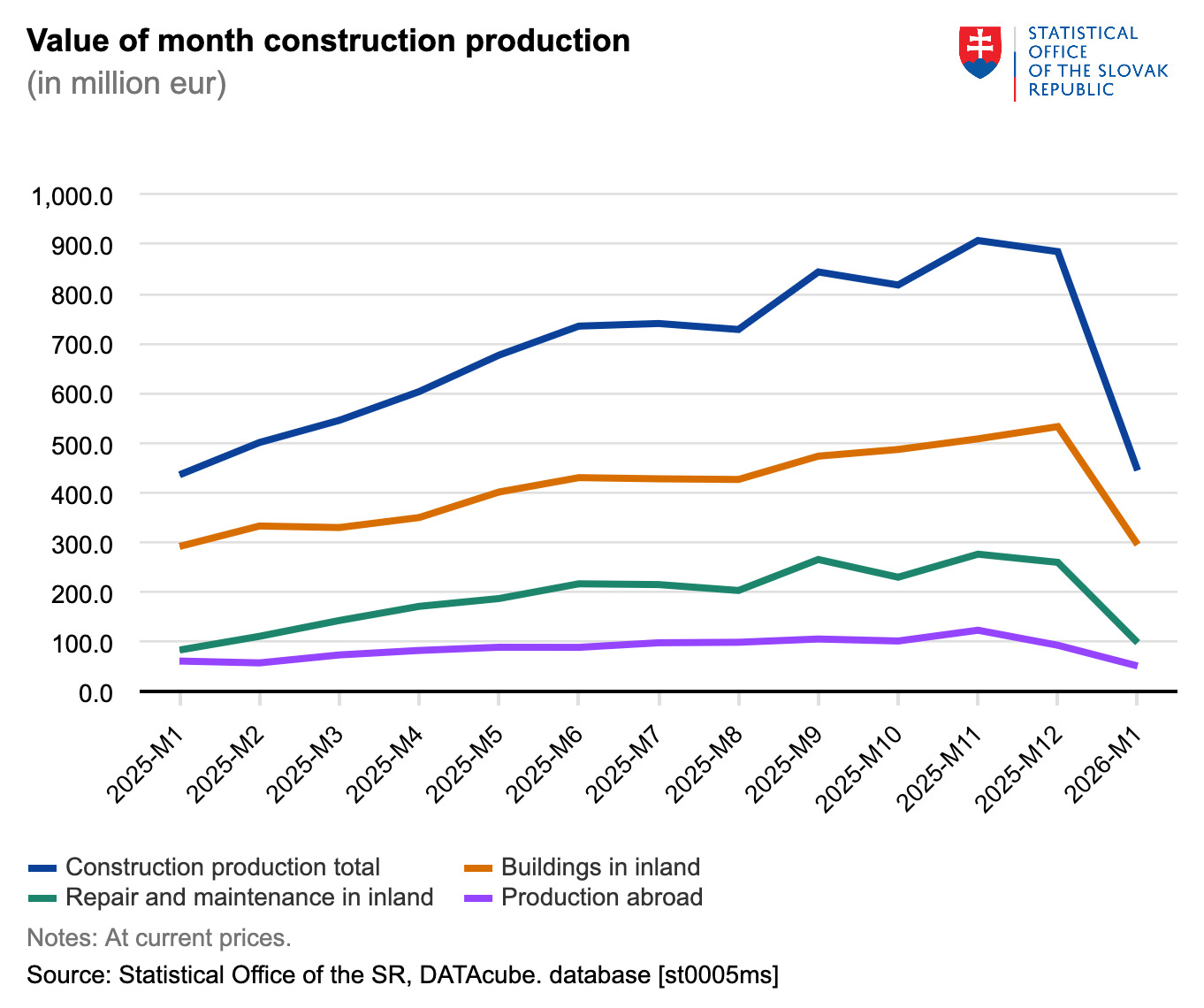 Despite the overall drop, construction work carried out within Slovakia showed a small increase compared with the same period last year. Domestic construction activity rose by around 1 percent, marking the third consecutive period of growth, even during the winter season when construction work is typically more limited. The improvement was largely supported by a higher volume of infrastructure projects, particularly road and railway construction.