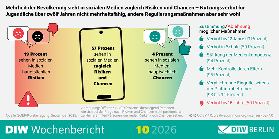 A large majority of people in Germany believe that social media poses risks for children and adolescents, but support for a broad age-based ban is limited. While most respondents favour restricting access for children under 12, there is no majority for raising the ban to age 16. Instead, measures such as media education, parental involvement and stricter regulation of platform providers receive significantly wider backing.