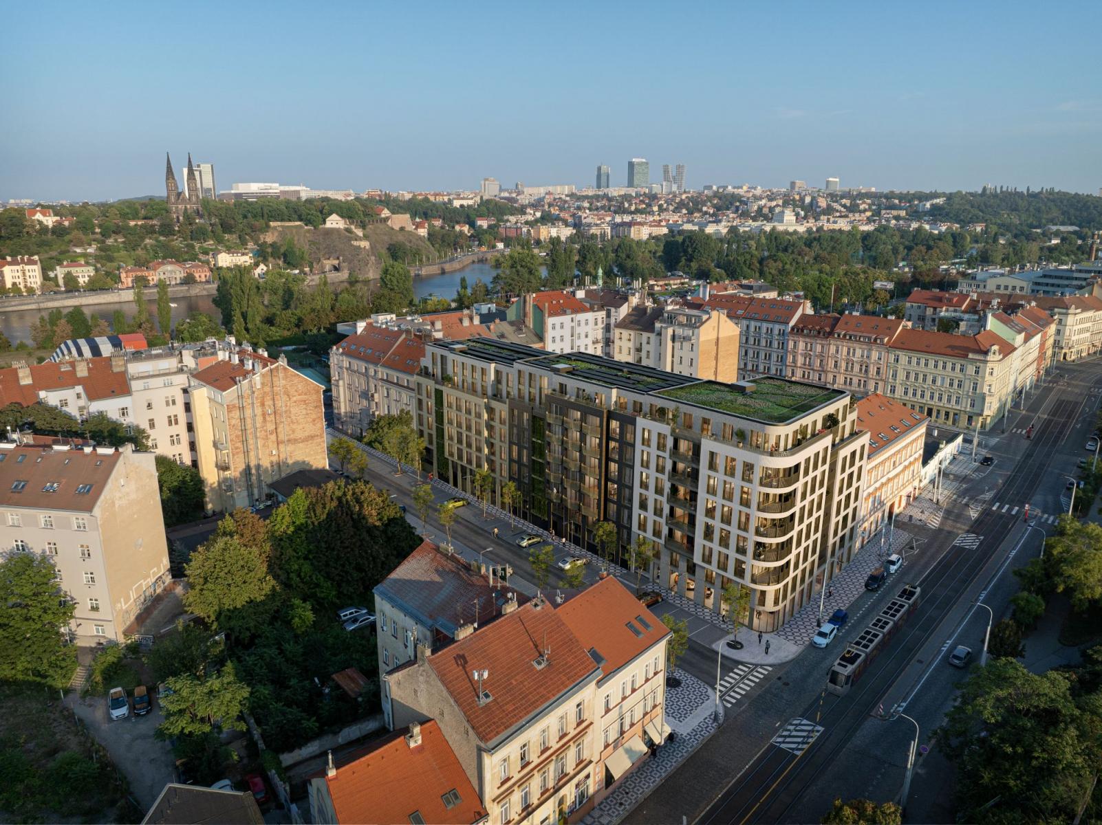 The development will offer a range of apartment layouts from 1+kk to 4+kk, with sizes varying between 28 m² and 112 m². Most units will feature balconies, with ground-floor apartments including front gardens with terraces and top-floor apartments offering expansive views of the Prague skyline. The building will also include a two-story underground garage providing parking for both conventional and electric vehicles.