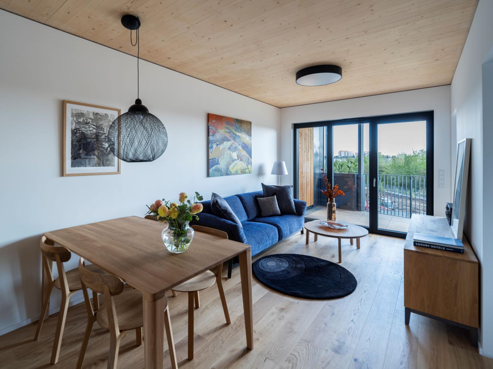 The model apartment, covering 51.6 m² in the L building, emphasizes the warmth and comfort of natural materials. “The wood accents in Timber Praha make the interiors inherently warm and inviting, even without furnishings,” says David Lukas, Chief Architect of UBM Development Czechia. The apartment features natural wood ceilings and oak parquet floors, while practical plasterboard is used on the walls. Furnishings also follow a natural theme, with a palette that blends shades of brown, white, blue, and grey to harmonize with the wood.