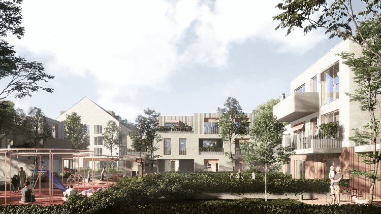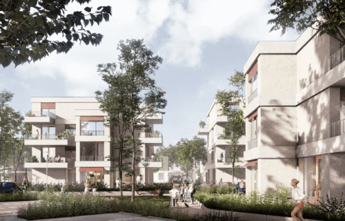 The masterplan covers an area of more than 12 hectares and foresees a mix of apartment buildings, smaller villa-style residential blocks and family houses. In total, the scheme is expected to deliver roughly 629 housing units, offering a range of options from one- to three-room flats to private houses with their own plots. The concept emphasises relatively low building heights and a varied urban structure intended to create a more intimate residential environment.