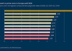 Europe’s logistics real estate market is entering a phase of consolidation, with moderate rental growth expected over the next five years, according to the latest GARBE PYRAMID-MAP mid-year update. GARBE Research projects that average prime rents will rise by €0.70 per square metre between the second quarter of 2025 and the second quarter of 2030, corresponding to a compound annual growth rate (CAGR) of 1.9 percent. This is a sharp slowdown compared to the 5.6 percent CAGR recorded from 2020 to 2025.