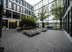 The four-storey office building, constructed in 2019, provides a total of 7,927 square metres of rental space. It also includes an underground car park with 90 spaces and landscaped courtyards designed for reception and lounge use. The location offers strong transport connections, with Bonn’s main railway station, the “UN Campus” regional train station, a nearby underground station, and access to the A61 and A59 motorways all within close reach.